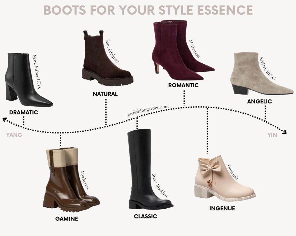 - For the Gamine essence, contrasting boots work well; you don’t have to limit yourself to solid-colored boots. As for materials, they can be mixed, including leather, suede, or structured fabrics.
