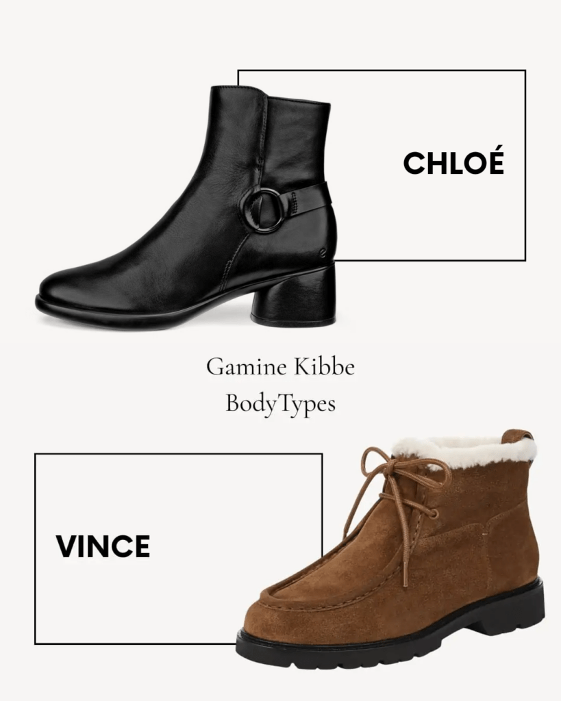 The Kibbe system is the tool for discovering which boots will look best on your body. Perhaps your body naturally looks better in structured, relaxed, soft, playful, or balanced shoes. If you still don’t know your Kibbe, you can take our quiz here or schedule your personalized consultation where you’ll receive a style guide with everything you need to know! These are some key aspects that can guide you in finding boots according to your body type: