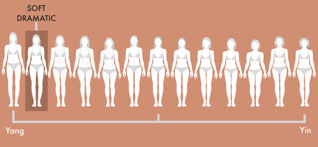 Soft Dramatics have Yang dominant bone structure and facial bones, but Yin body flesh and facial flesh. They look tall, but are not as sharp as a pure Dramatic. This is considered to be the second most Yang. However, a person with a Soft Dramatic Kibbe ID can look more feminine or masculine depending on their essences.