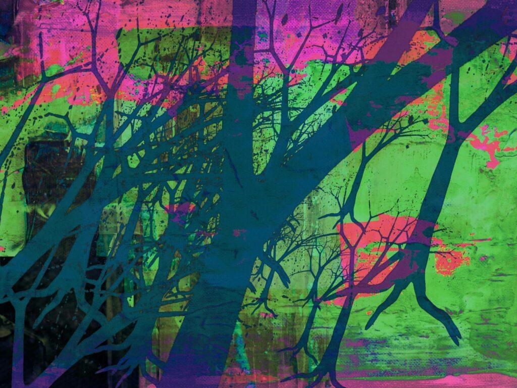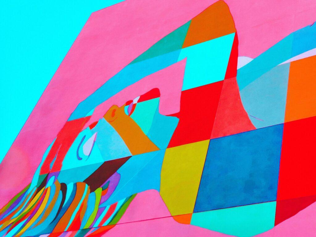 J) Neon signs, cassette tapes, and a bold patterned comforter