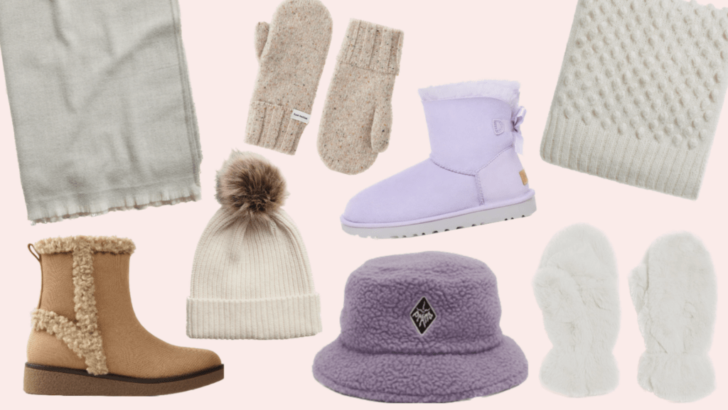 Bucket hats and ear warmers are key items. Think of fuzzy textures like teddy or faux fur.